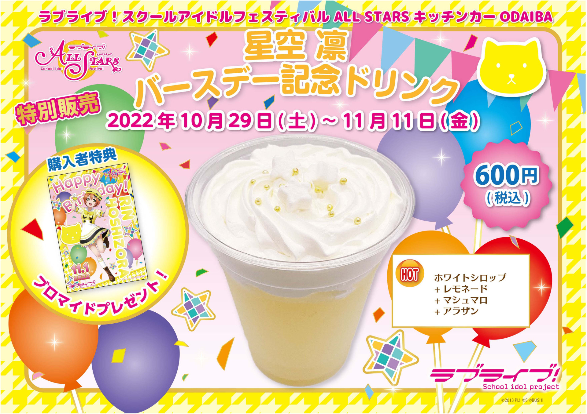 対象期間中に以下の対象グッズを含む1注文につき、「星空 凛」バースデーブロマイドを1枚お付けいたします。