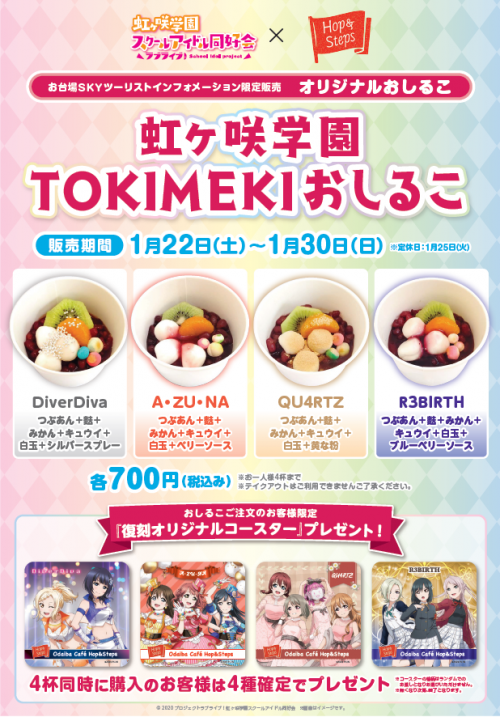 お台場にある観光案内所『お台場SKYツーリストインフォメーション』にて『虹ヶ咲学園TOKIMEKIおしるこ』の販売が決定!